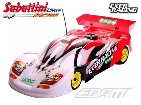 SabattiniCars presenta la nuova Edam Exer GT 1/8 venduta in Italia completa del radiocomando digitale 3DJ 2,4 GHz. Probabilmente si tratta del primo automodello Ready To Run della categoria 1:8 pista. E' stata progettata con le stesse geometrie del modello Pro Kit Competition con numerosi optional inclusi quindi le performance in pista sono di buon livello.
